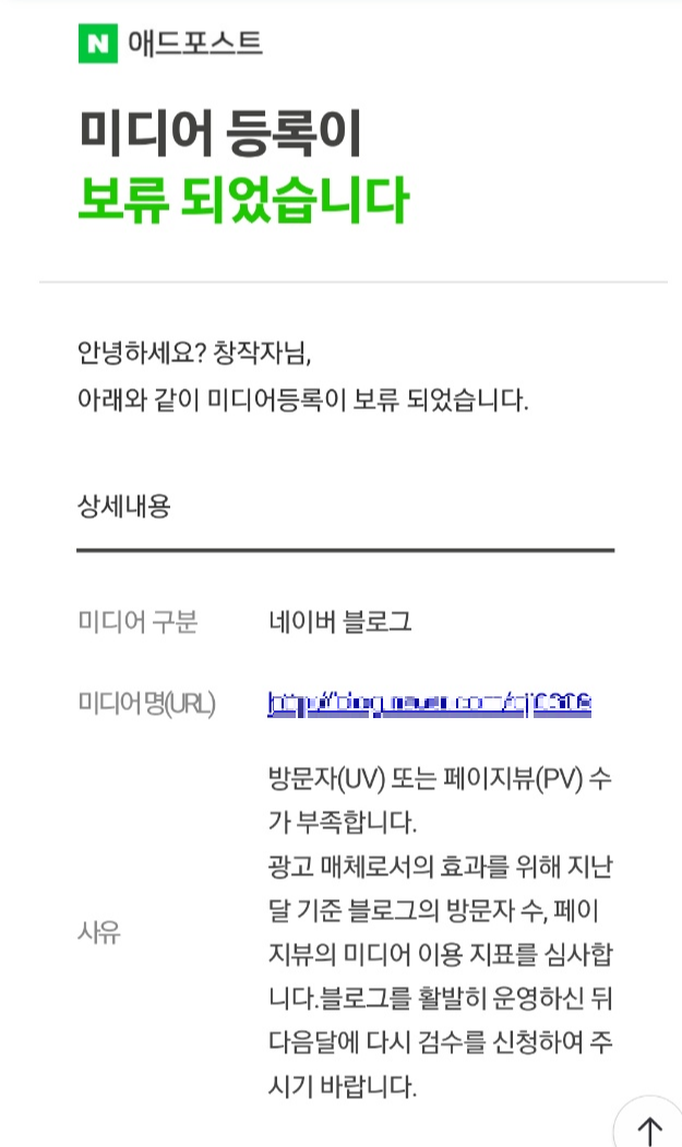 혹시나 하고 일방문자 100도 안될 때 애드포스트 승인신청을 해봤더니 결론은 보류.