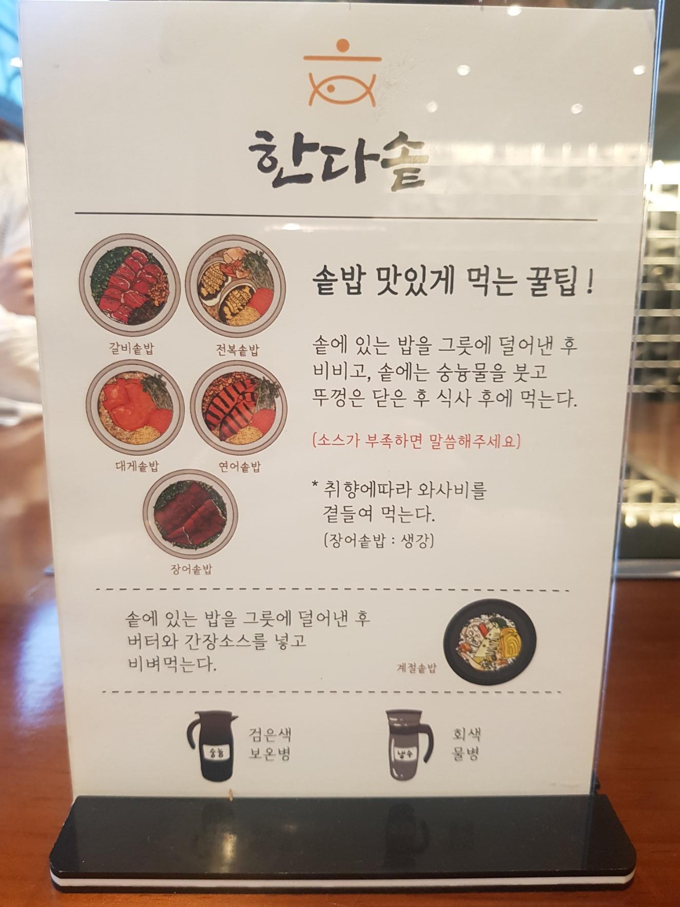 자리를 잡고 나서 메뉴를 골라봅니다. 솥밥 맛있게 먹는 꿀팁도 주의 깊게 읽어보고요