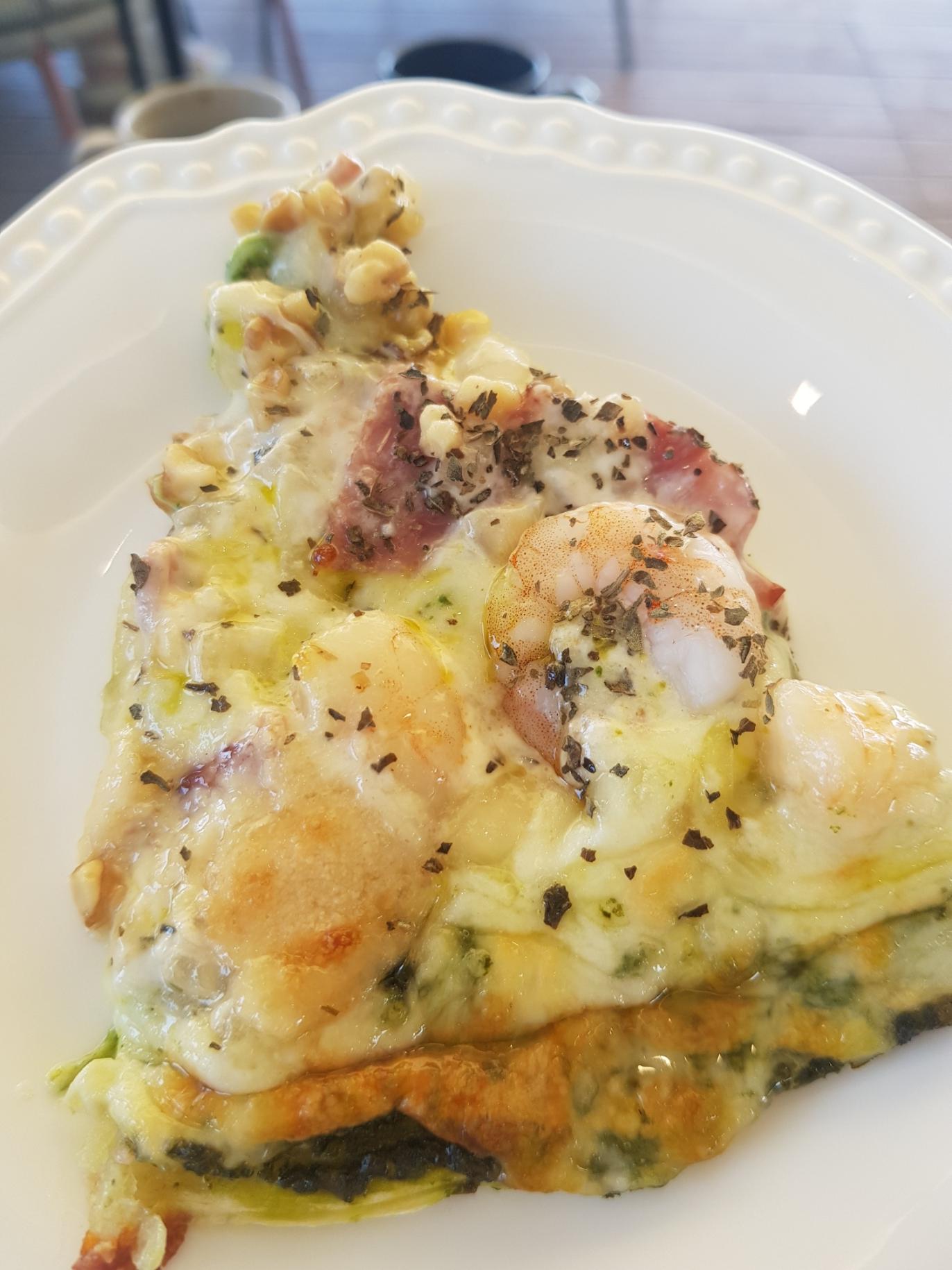 바질페스토피자인데 통통새우도 제법 들어가 있고 치즈도 듬뿍녹아져 있습니다. 피자 기다리는 동안 커피를 다 마셔버려서 시원한 음료로 다시 주문하였네요