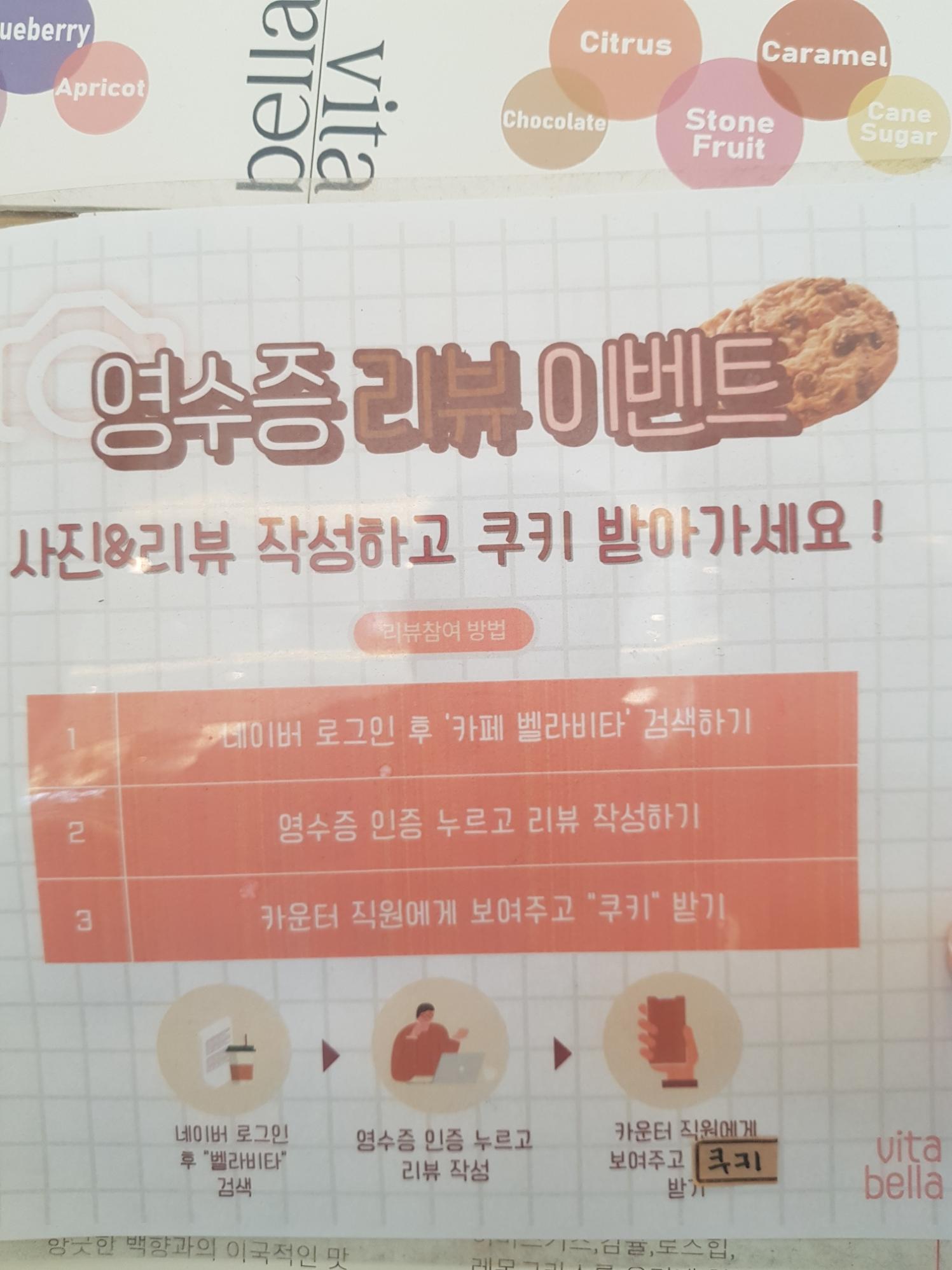 즉석에서 영수증 리뷰해서 쿠키하나 받아왔네요. 소소하지만 은근히 맛있는 쿠키하나 받아오면 제대로 즐기고 온 느낌이 든답니다. 벨라비타 카페 바로 옆에는 식당들이 몇 군데 있어요