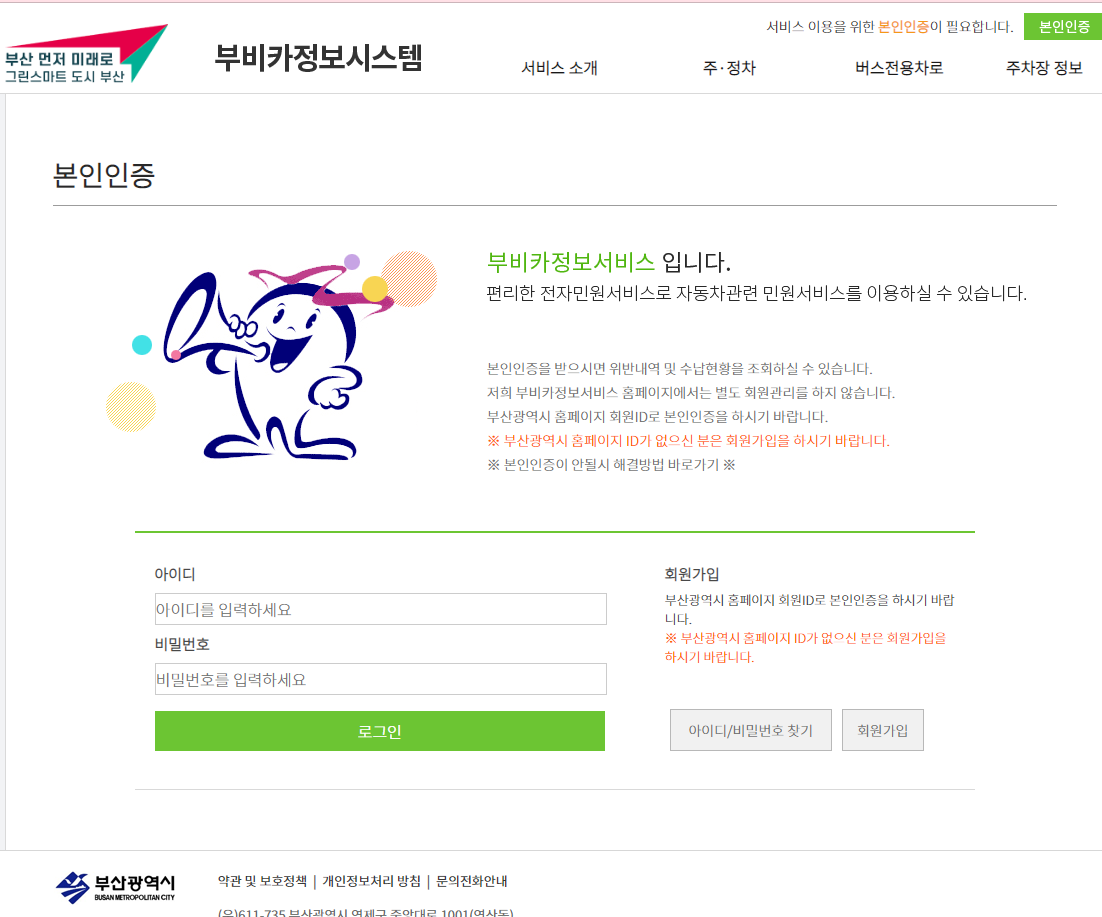 부비카 서비스는 부산광역시에 운영하고 있는 주·정차 및 버스전용차로 위반 정보를 조회하는 홈페이지입니다