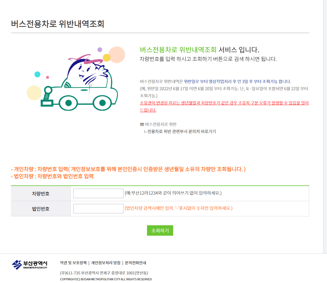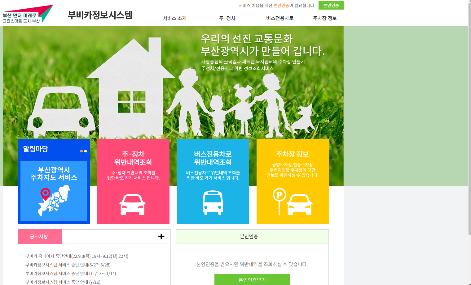 부비카 서비스는 부산광역시에 운영하고 있는 주·정차 및 버스전용차로 위반 정보를 조회하는 홈페이지입니다